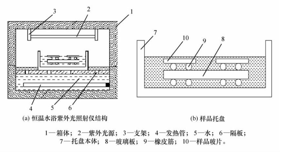 恒溫水浴紫外光照射儀的箱體由不透明材料制成,保證箱體不透光、避免紫外光外泄,對人體造成傷害。箱體內(nèi)的頂部設(shè)有紫外光發(fā)射裝置,紫外光照射劑量可調(diào)。箱體內(nèi)裝有水,水中設(shè)有發(fā)熱管,對水進(jìn)行加熱并保持恒溫。樣品托盤包括托盤本體、玻璃板和橡皮筋,托盤本體由耐酸耐堿的防腐材料制成,用于盛載樣品浸液;玻璃板放在托盤本體內(nèi),橡皮筋圈在玻璃板上;每塊樣品玻片分別架在橡皮筋上,這樣使樣品玻片與玻璃板之間有一定間隙,方便樣品玻片的取出。托盤本體和樣品玻片放置在紫外光裝置的下方、隔板的上面,隔板有孔,使水充分地接觸樣品托盤底部,更好地實(shí)現(xiàn)恒溫水浴的效果;托盤本體底部與紫外光裝置需要保持一定距離,以確保紫外光能夠均勻照射到樣品托盤上。